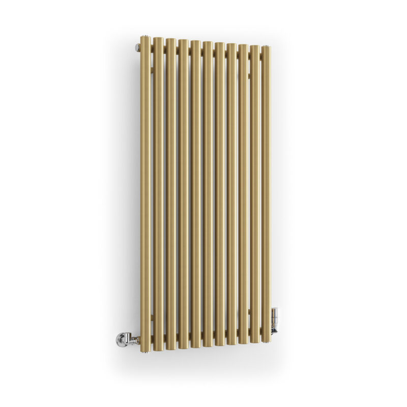 This radiator is designed to be mounted vertically, making it a great space-saving option for any room. Made from low carbon mild steel and finished in a beautiful brass colour, it is both durable and aesthetically pleasing. Measuring 1200mm in height and 590mm in width, it is available in four sizes to suit your needs.
